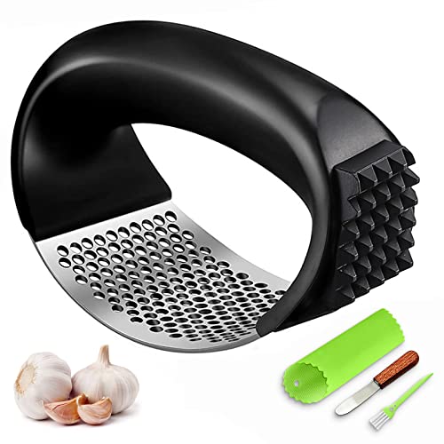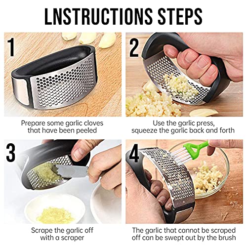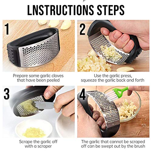 - 【SUPER VALUE COMBO SET】 The garlic press set contains stainless steel garlic press, silicone garlic peeler, scraper and cleaning brush. Perfect kitchen gadget for home and restaurant, saving time and labor.