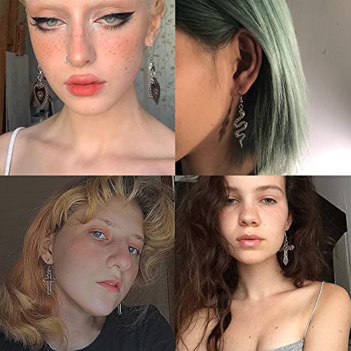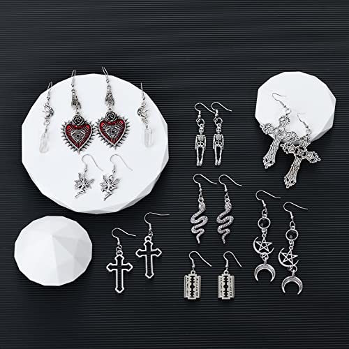 - Diverse Designs: 9 pairs with different designs gothic earrings, matched with evil eye bat red heart earrings, cross earrings, crystal moon star earrings, skull skeleton earrings, snake earrings,angel earrings, razor blade earrings, which integrates your own wearing style and decorates your daily life and work.