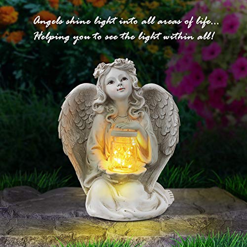 - π LIGHT UP GUARDIAN ANGEL lifts her face in a pure and joyful celebration of love with glass mason jar in her hands which is solar powered and the fairy lights inside will illuminate a warm & beautiful glow at night. Sculpted with a wonderfully detailed face and exquisite feather wings, this adorable guardian angel is cast in high quality resin with antique white finish. Our guardian angel will make your garden heavenly!