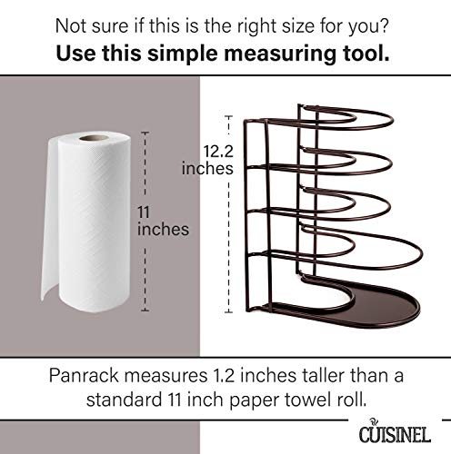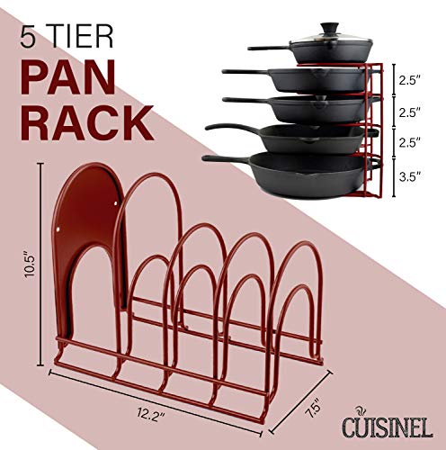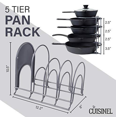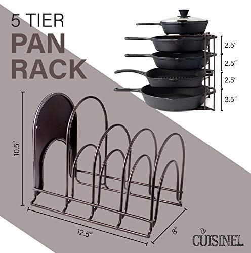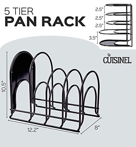 - 5 TIER DESIGN: The entire organizer is 12.2” high, with three 2.5” slots and one 3.5” slot to accommodate your larger saucepan. You can easily stack smaller pans and skillets within one slot to save more space.