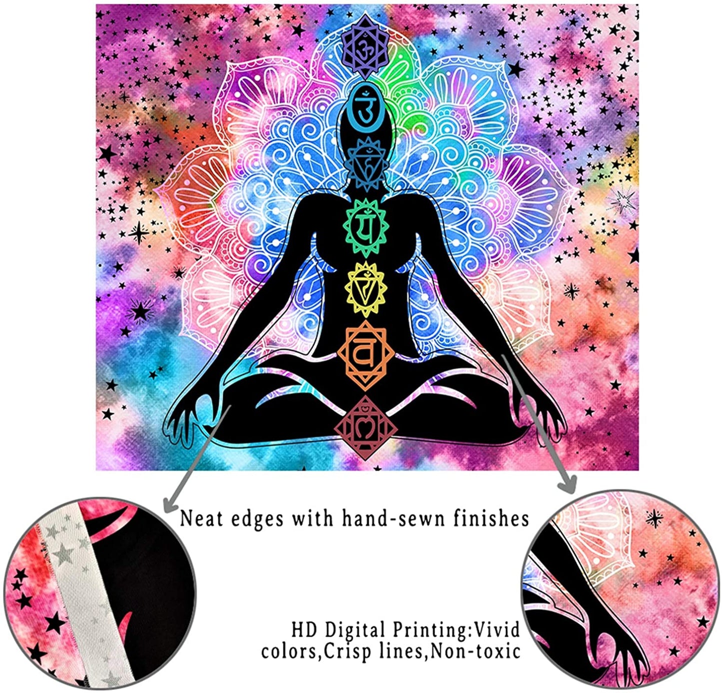 PREMIUM MATERIAL: Seven chakra tapestries is made from 100% polyester fabric, which is soft, durable, skin-friendly, no pungent smell, lightweight and easy to hang or pack away no matter for indoor and outdoor use. Suitable for 4 seasons.