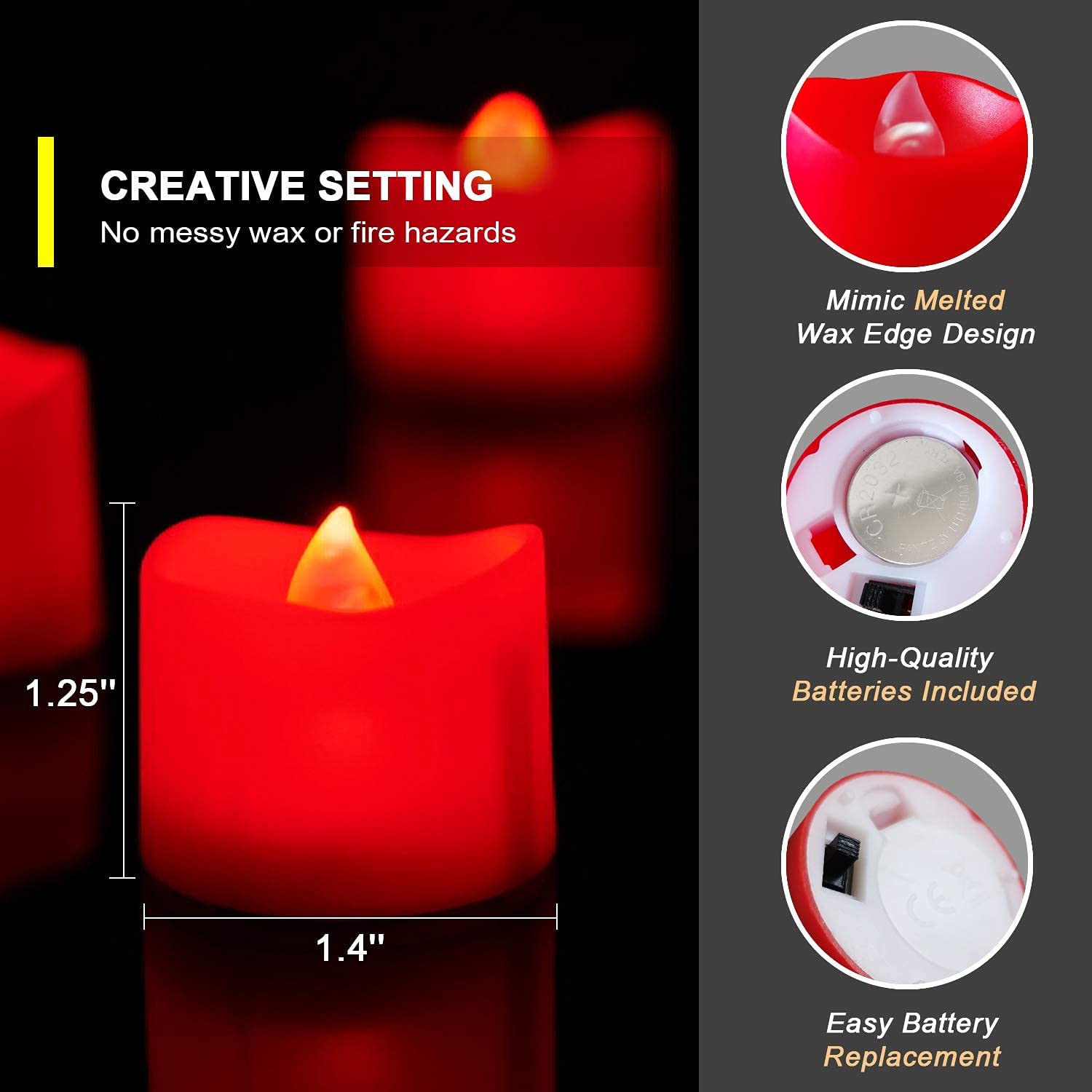 Value bulk set: Pack of 24 red light tealights with high-quality batteries pre-installed, each battery has at least 150 hours of light-time. All this means less cost on tea lights