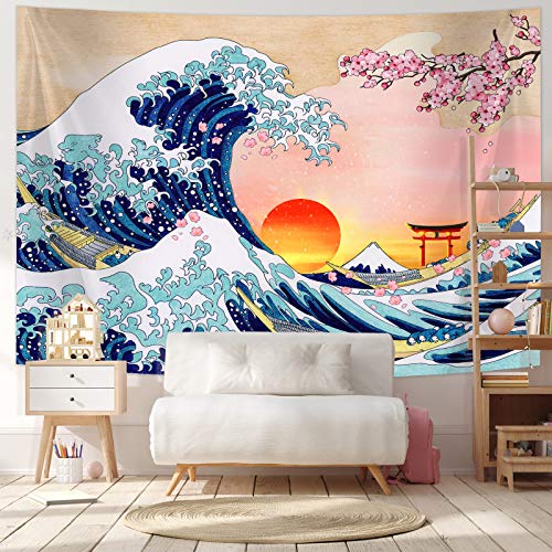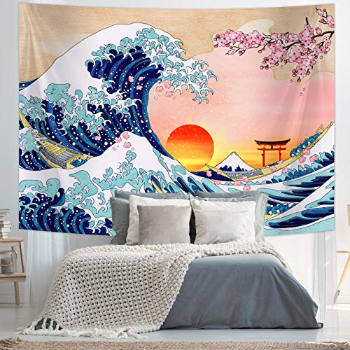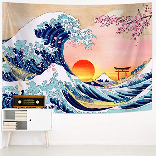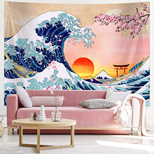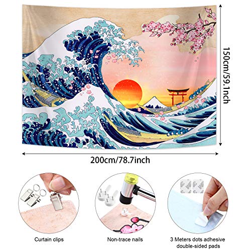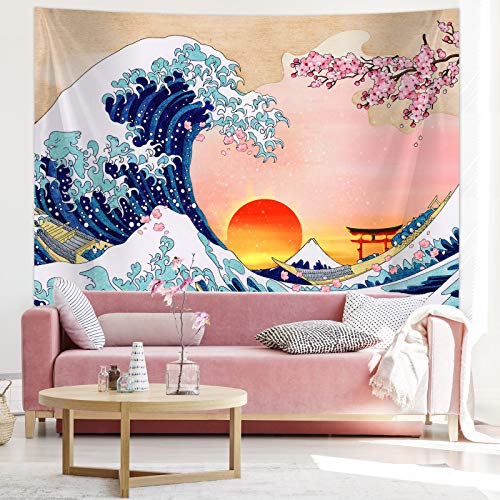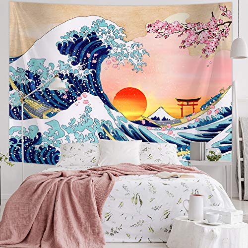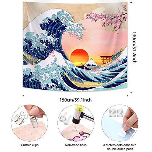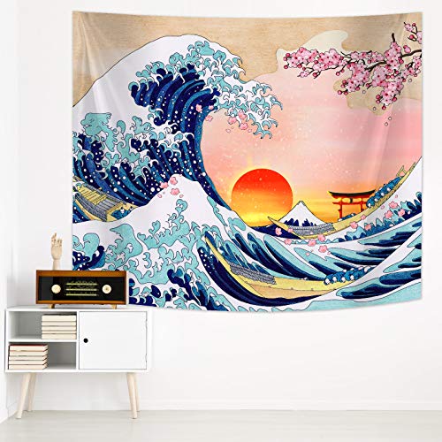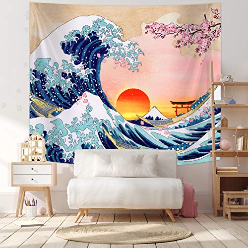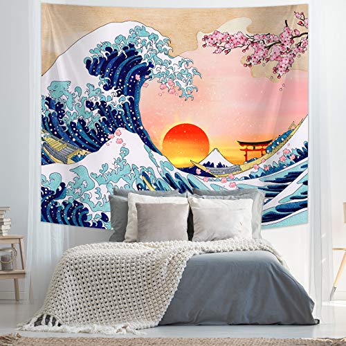 - Glamorous and dreamy design: this Japanese wave wall hanging tapestry is designed with Japanese elements, like Kanagawa, Fuji mountain, sun, building and cherry blossom, it's a great way to add colors to your bed, ceiling, and wall, making your room full of artistic sense