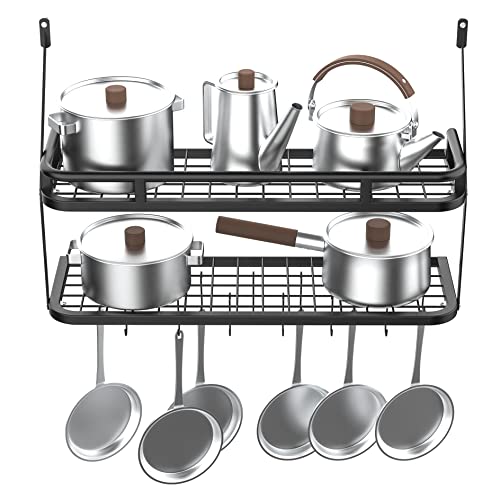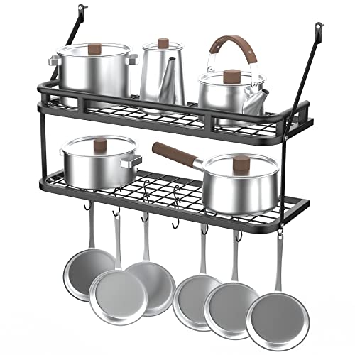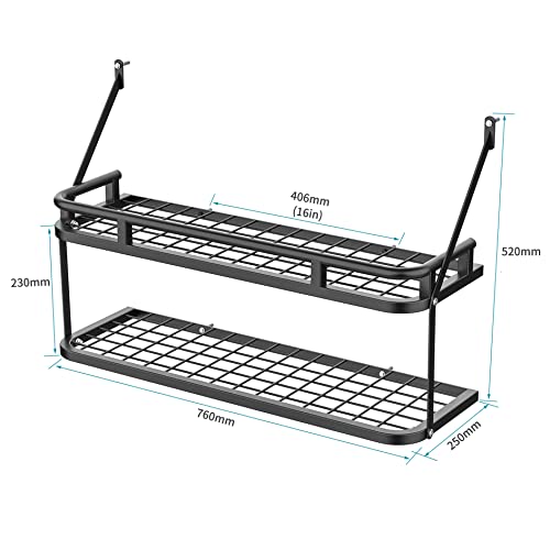 - Heavy Duty & Large Storage Capacity: The pot rack has 2 shelves measured at 29.75” L*9.75” W, holds up to 75lbs/shelf, fits all large pots and has tons of room to hang. It’s great to hold the weight of pots, pans and mixing bowls.