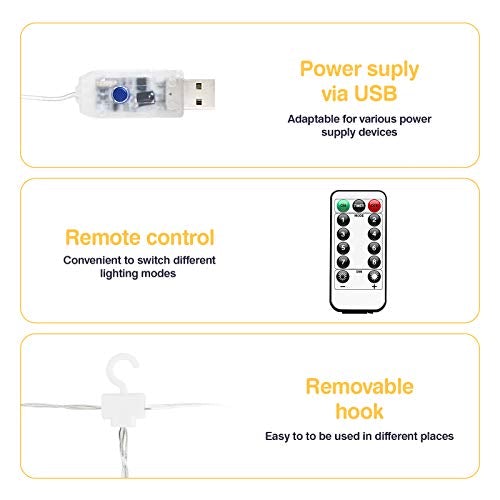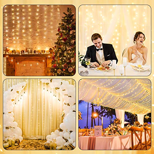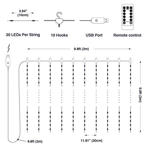 - 8 LIGHT MODE SETTINGS - These string lights are warm white and contain 300 LEDs. They can cover an area of almost 10x10 feet. The LED fairy lights have 8 lighting modes. These beautiful, magical twinkling lights are the perfect addition to your home decor or special event decor. The lights can be controlled to stay steady on, blink, flash, fade, chase, and more. With 8 light modes, you can set the ideal look for any type of setting.