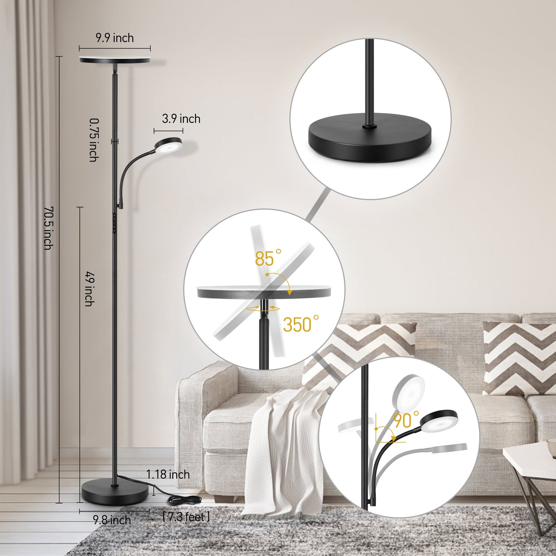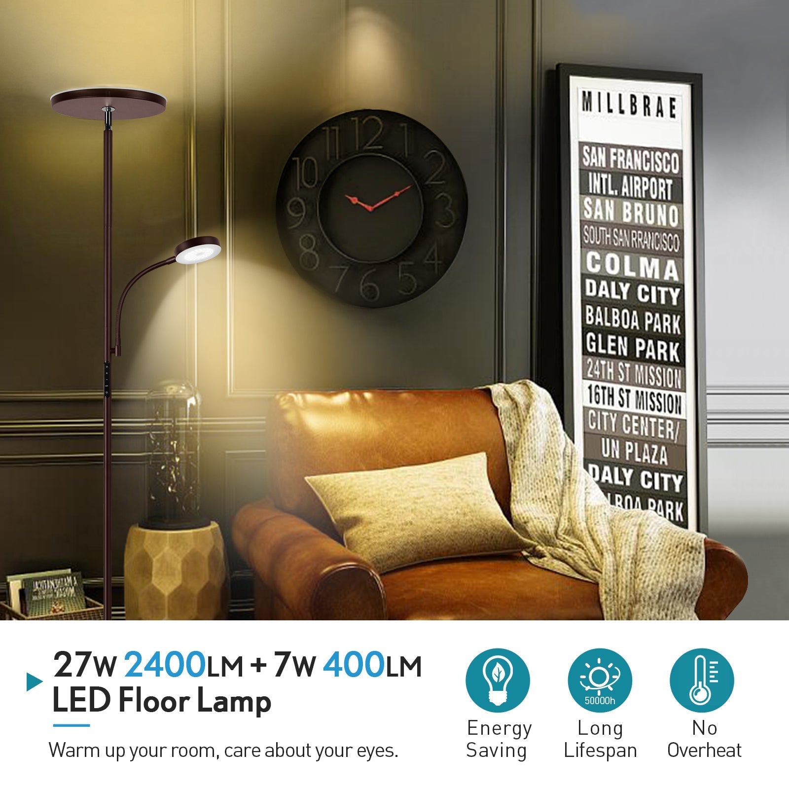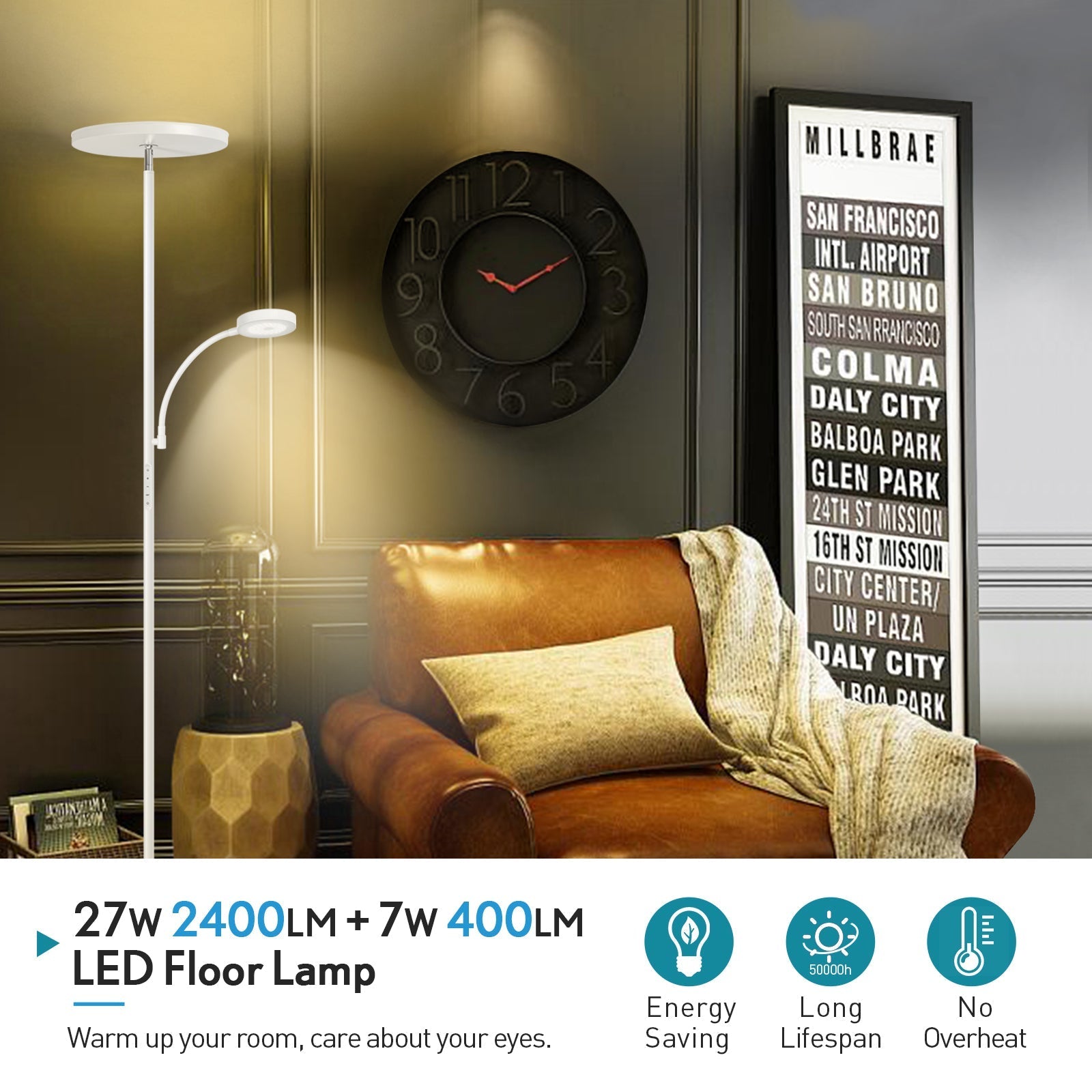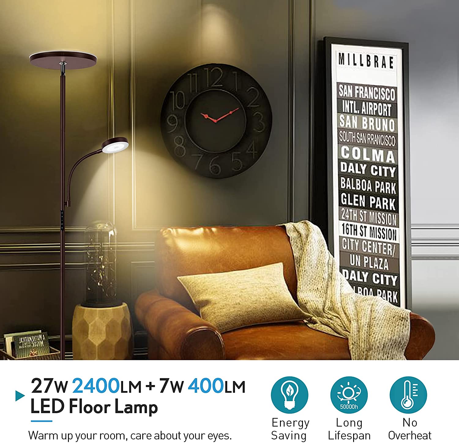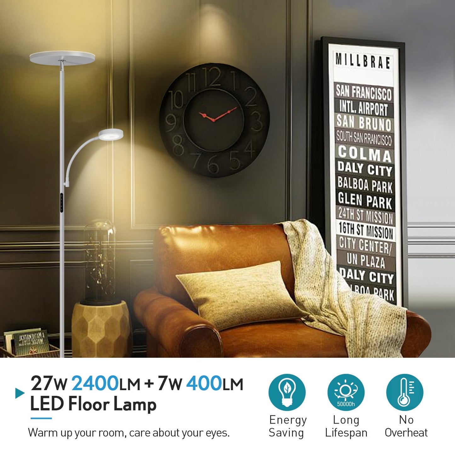 - Built-in 126+28 high brightness LEDs, up to 2400+400 lumen step-less dimming standing lamp is enough to light up your living room and has 40,000 hrs lifespan to save you from the trouble of replacing lamps frequently.