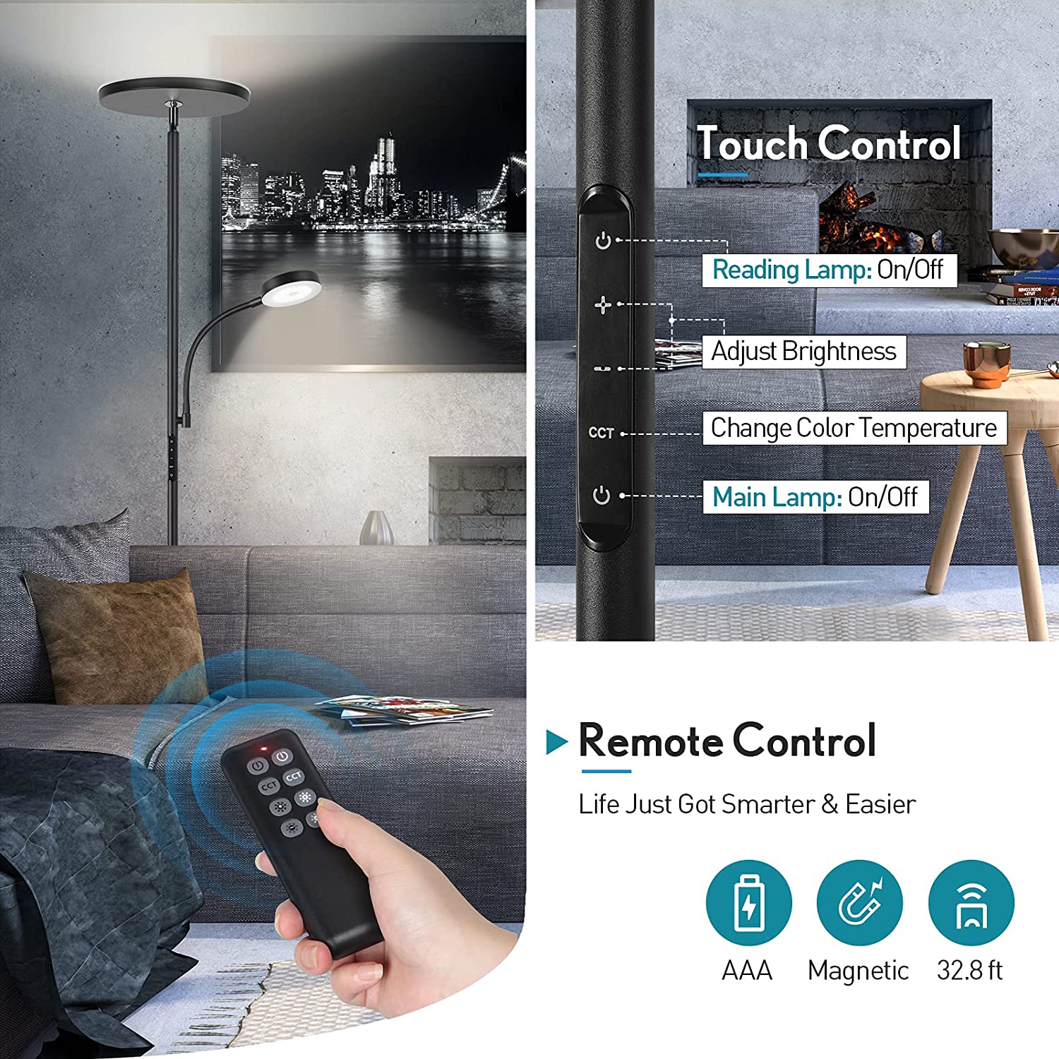 - Remote and Touch Control: The two heads of our modern standing floor lamp can be controlled independently. The lamp can also be compatible with Wall switches and Smart plugs. Besides, the magnetic remote control can stick to the metal pole or fridge, which makes it easier to be reached(Within 32.8ft).