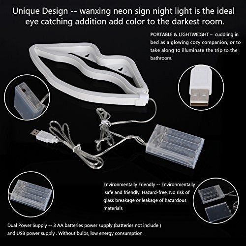 - ★Unique Design -- wanxing lip shaped neon signs night light is the ideal eye catching addition to your party or home table or wall , with the comfortable warm light , a wonderful neon art light to replace the boring desk lamp and add color to the darkest room.