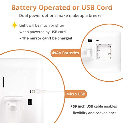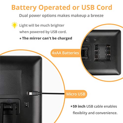 - DOUBLE POWER SUPPLY - This make up mirror can be powered with either 4xAA batteries (not included) or a USB cable (included). And this desk mirror cannot be rechargeable