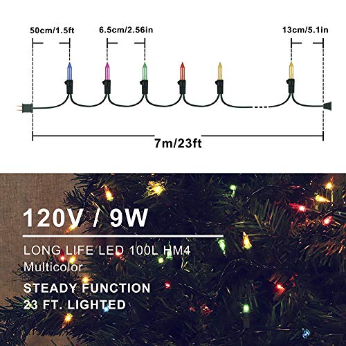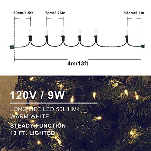 - ♥Christmas Decoration String Lights:2 PACK 50L Christmas mini string lights is 13ft in total-Green wire with Bulbs: 3.5m/11.5ft, cord without lights 50cm/1.5ft, spacing between every LED: 7cm/2.76in. With Thicker green wire with strong insulated copper core, tangle-free to use, High quality UL certified products ensure the safety of you and your family.