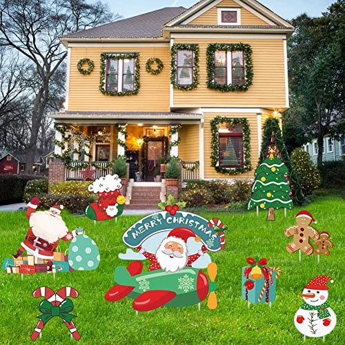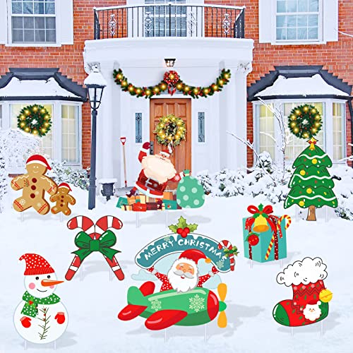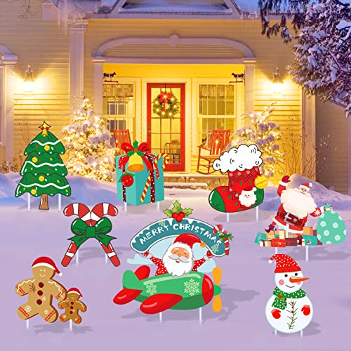 - UNIQUE DESIGN - 8 christmas yard decorations Contains Santa Claus Sign, Snowman Sign, Gift Box Sign, Xmas Tree Sign, Christmas gingerbread Man Sign, Christmas stocking Sign, Christmas Canes Sign, Merry Christmas Sign