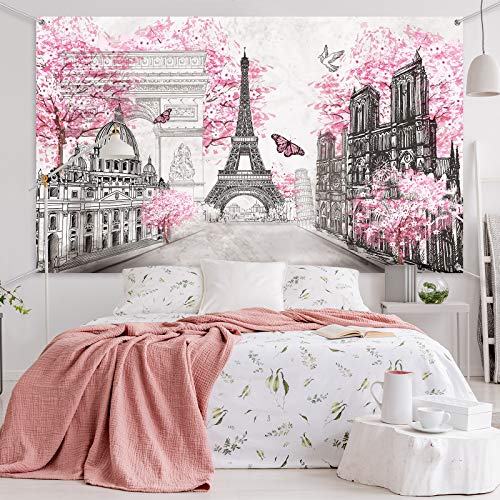 Paris Backdrop Eiffel Tower European City Landscape Pink Wall Hanging Tapestry 72 x 43Inch