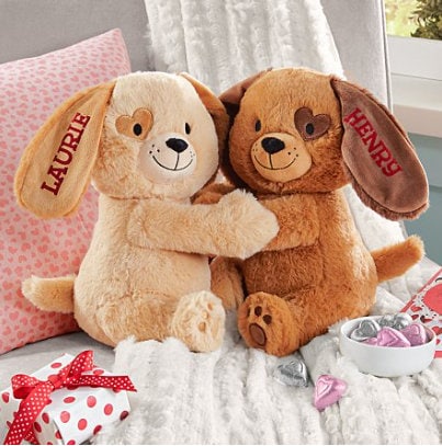 PUPPIES! Is there a more paw-some way to show your love? These adorable hugging pups will raise the woof this Valentine’s Day. They’re soft, cuddly and personalized just for two! Exclusively from Personal Creations.