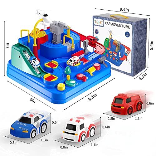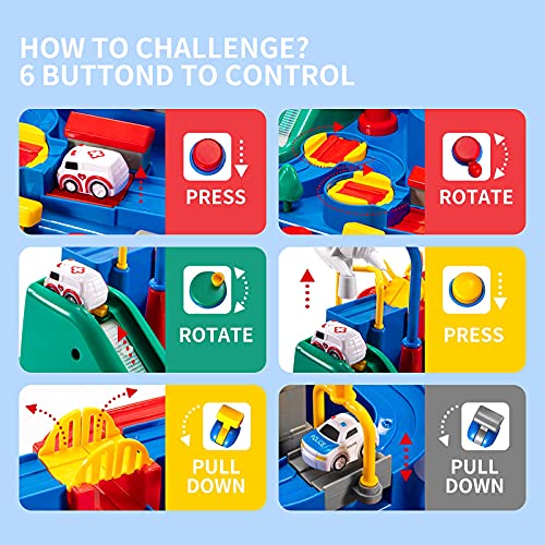- PERFECT CHILDREN'S TOY SET - This car adventure toy has the perfect design, with 6 buttons and 8 different challenges, 3 mini cars: police car, ambulance, fire truck. It helps to train and improve children's motor skills and hand-eye coordination by guiding children through every obstacle and challenge.
