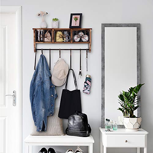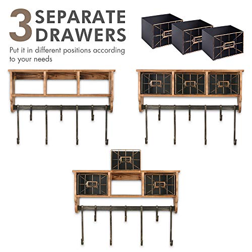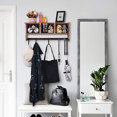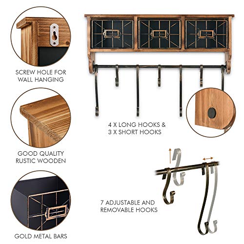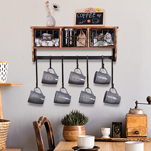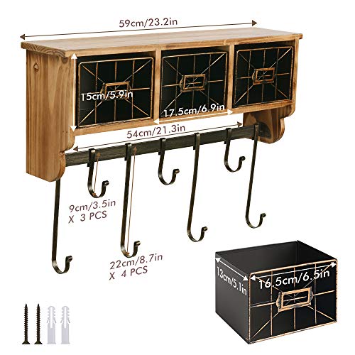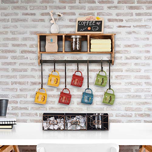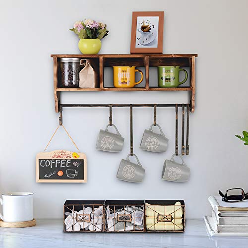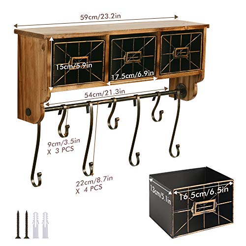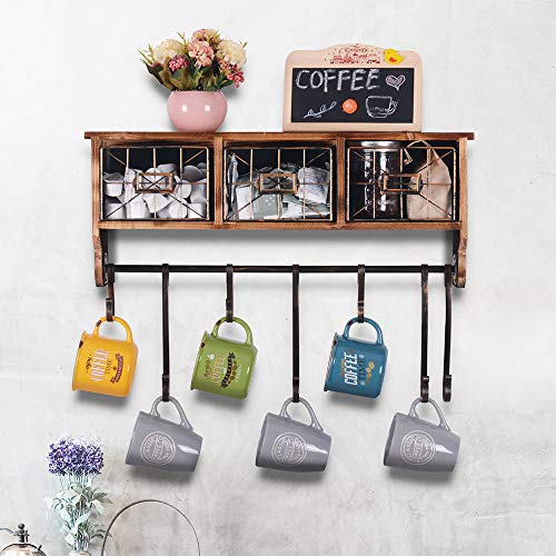 - 【LARGE CAPACITY】 Designed with 3 removable baskets, this coffee bar shelf with hooks is easy to pull it out and provide convenient storage, and the 7 hooks(straight shape) with different length can hold your coffee mug, cup, keys, hat and more. 23.2" x 5.9".
