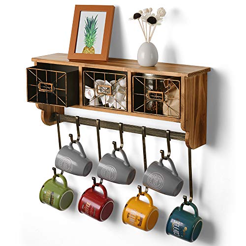 - 【WOOD SHELF & EASY TO HANG】This wall mounted coat rack is made from solid wood and high quality golden painting metal, it shows entirely hand-made with fine workmanship from the details. Our mug wall organizer is easy to mount on the wall by including screws.