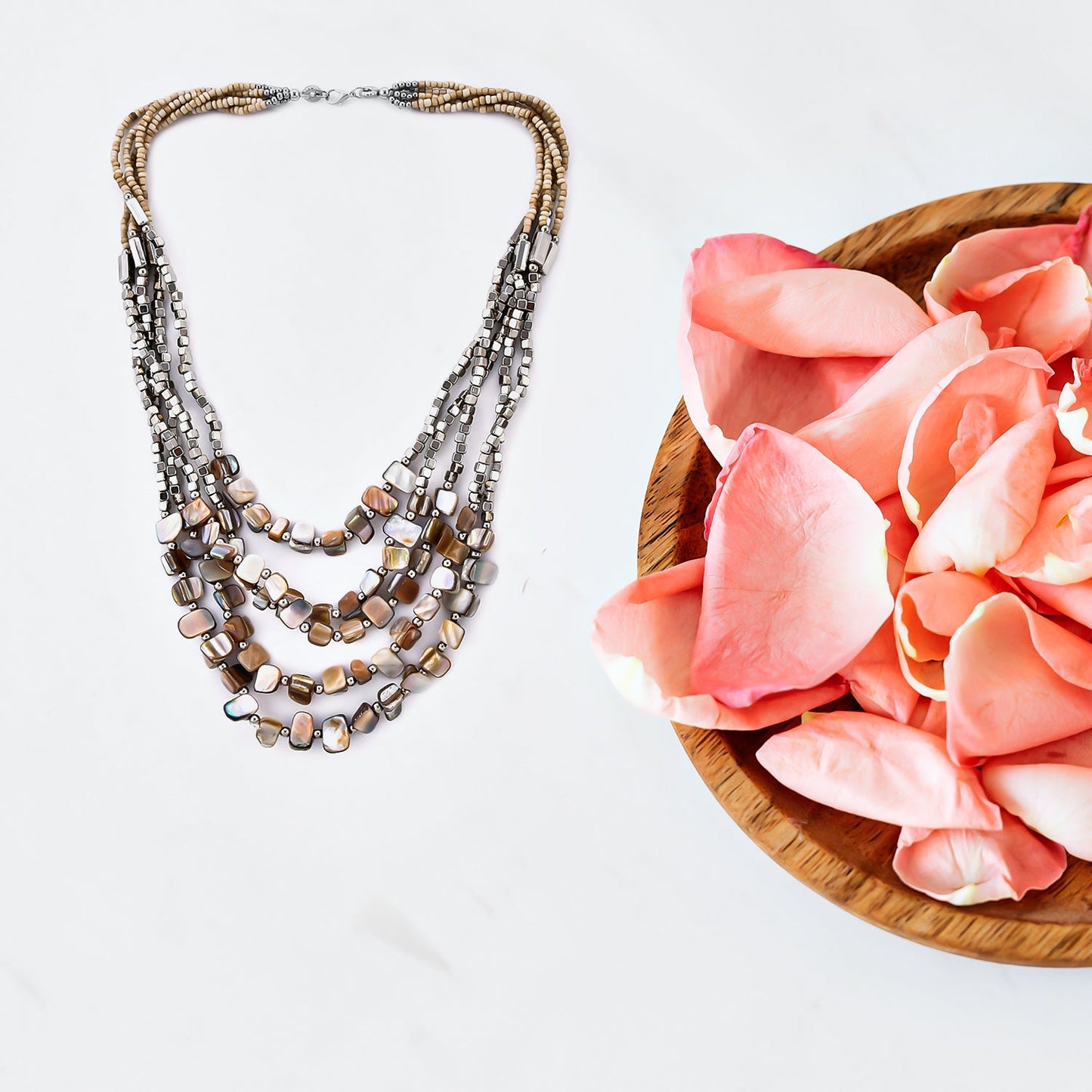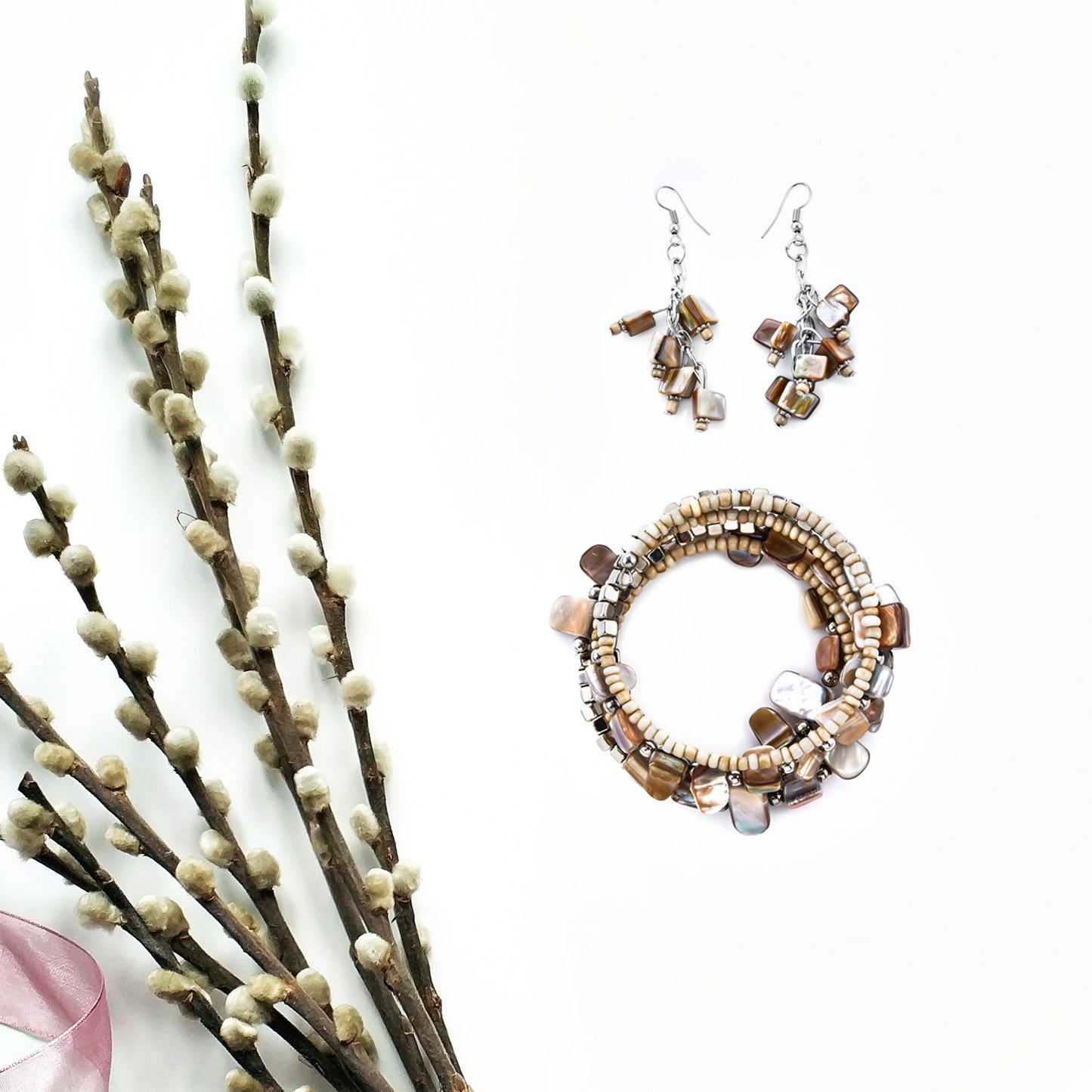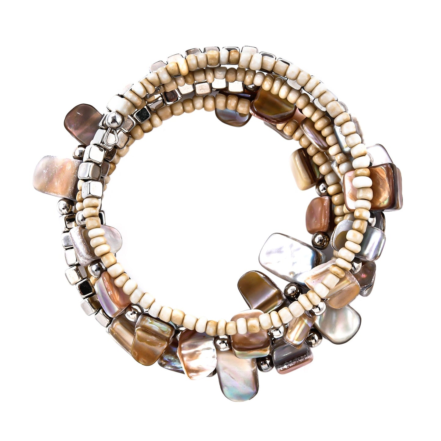 Look creative and quirky by impressing everyone with these shell and bead earrings, a wrap bracelet, and a necklace. Attend a wedding party or a formal event, this modern set of jewelry will bring you in the limelight.
