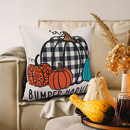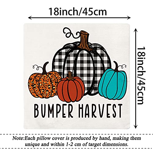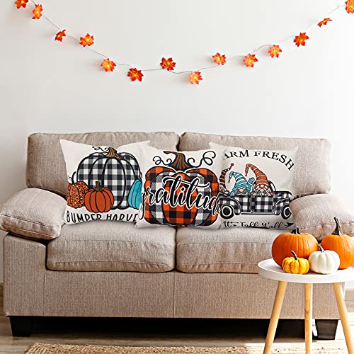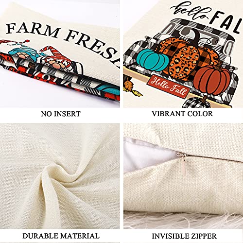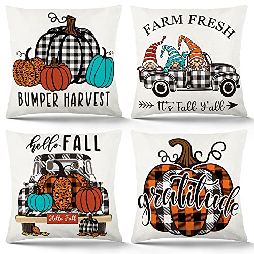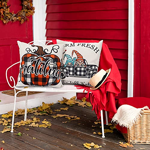 Set of 4 Fall Decorations Thanksgiving Plaid Gnomes Pumpkin Pillow Covers 18x18 Inches