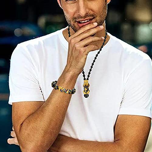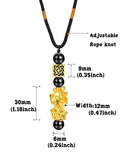 - Product Details -- The necklace made of alloy pi xiu and amulet pendant, black adjustable wax rope necklace max size 27.56in. The black bead necklaces 25.6in. The feng shui bracelets are made of 12mm/0.47in black obsidian wealth bead, pi xiu size: about 30mm/1.18in, adjustable bracelet 60-90mmcm/2.36-3.54in, elastic bracelet 60mm/3.54in, can fit your wrist well, not easy to deform and break, one size is suitable for most people to wear, save your time and energy to choose size.