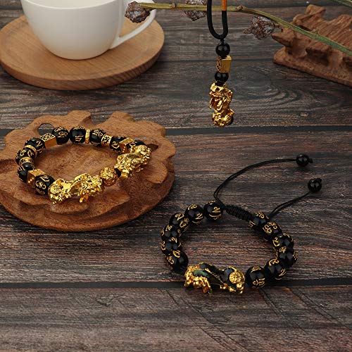 Set of 4 Feng Shui Pi Xiu Pi Yao Bracelet Necklace Set Black Obsidian Wealth Bracelet with Hand Carved Amulet Bead