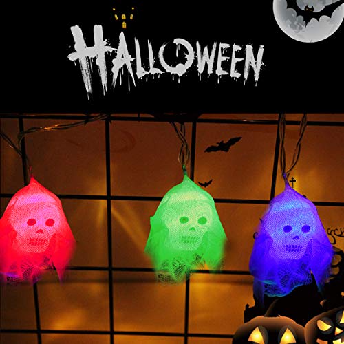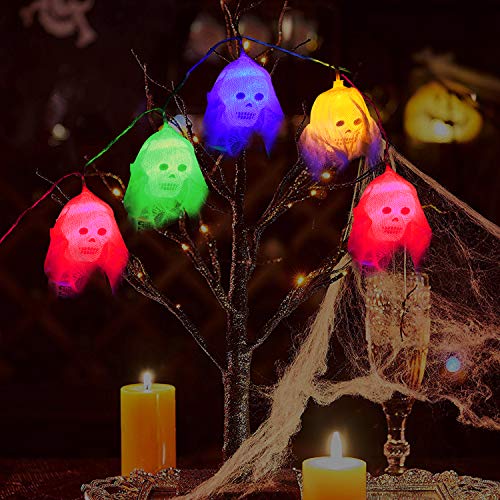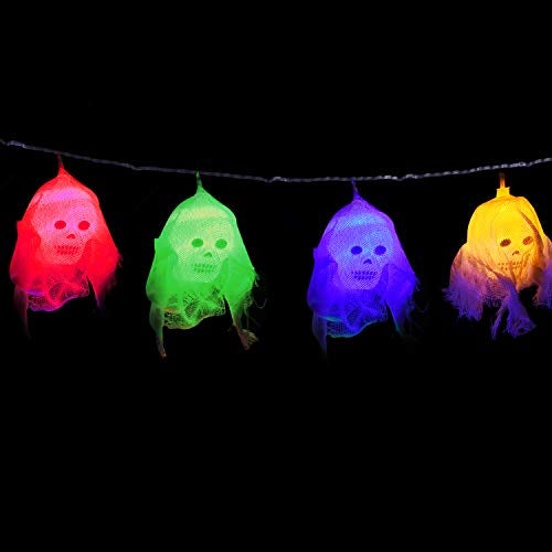 - Multi-color 10 LEDs Ghost Lights - 10 LEDs string lights glow in 4 colors (blue, green, red, orange ), which makes the Halloween theme fun and spooky. Each skull is about 2.3 inch tall, and it stands out just the way it should when you switch on the light.