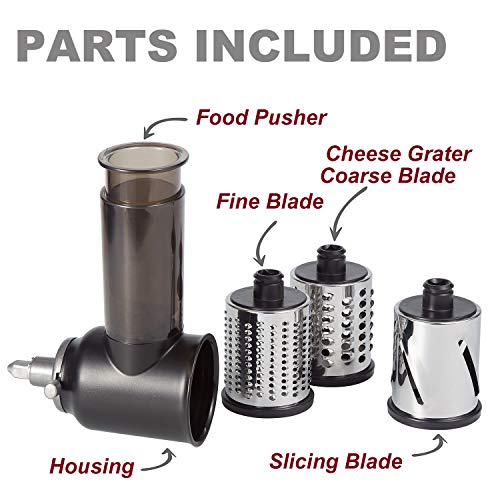 - Multifunctional & professional slicer/shredder attachment: 360 degrees hole stainless steel blade design, includes Slicing Blade (for cucumber, zucchinis), Cheese Grater Coarse Shredding Blade (for cheese, carrot, mushroom) and Fine shredding blade(for nuts, pizza toppings)