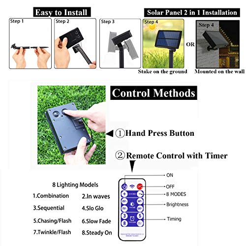 - 【8 Lighting Modes. Steady or Twinkle. with timer Remote 】Hand Press the “mode” button on the back of solar panel or remote control to cycle through 8 lighting effects:Combination,In waves,Sequential,Slo Glo,Chasing Flash,Slow Face,Twinkle Flash,Steady On.For saving the power,you can remote control the timer setting 3/5/8 hours.