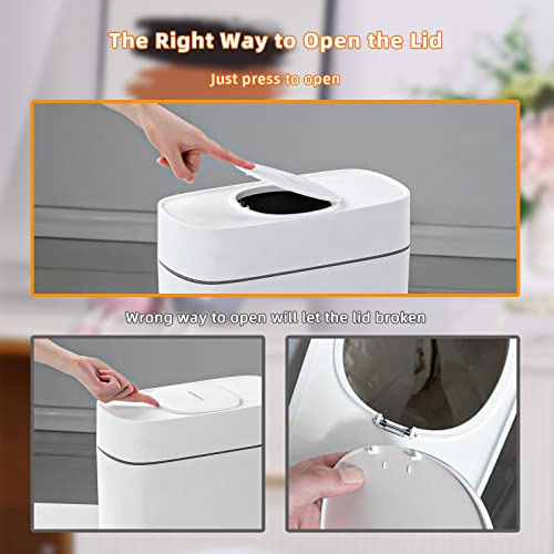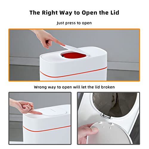 - 🔥Important Notice🔥: This garbage bins for bathroom is a press top lid type trash can, just one touch click to open. Please don't violent opening, there is just one way to open, press the marked opening position to open! Please dont put your fingers under the lid and lift the lid. This is a wrong way to open the lid, the lid will be damaged. This is not a quality problem! If you find the lid can't open smoothly, please lift up the buckle a little, then it will works good.