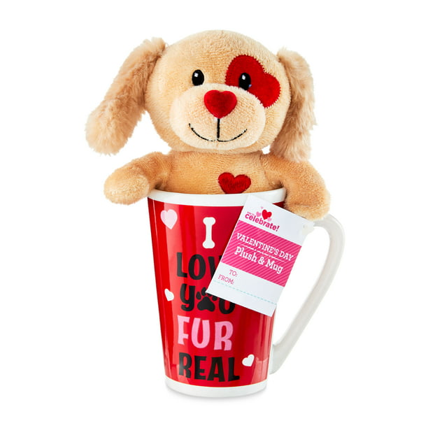 Show your loved one how much you love them this Valentines Day! Valentines Day Plush Toy in Latte Mug, Puppy. This Valentines Day gift set features a removeable plush toy in a latte mug. Our little plush toy is an adorable puppy that is made of an oh so soft fabric and comes decked with floppy ears, ready to wish you a Happy Valentines Day. Our little puppy comes in a latte mug made of ceramic stoneware that is microwave and dishwasher safe. This mug features a whimsical script to convey that message of love to that someone special. Our Way to Celebrate! Valentines Day Plush Toy In Latte Mug, Puppy will make the perfect gift to share that favorite coffee with our loved one served with love this Valentines Day.