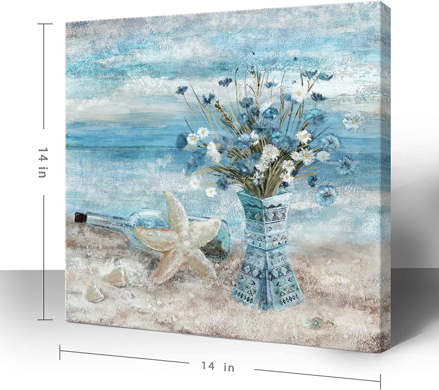 - 【Serene Beach Canvas Art】-This blue wall art bring a touch of the beach's beauty into your home.The calming ocean canvas print showcases starfish resting on beach along with a drifting bottle,seashell,beautiful daisy floral bloom in a vase.This eye-catching seascape wall art make it an ideal decorating choice for a variety of spaces.