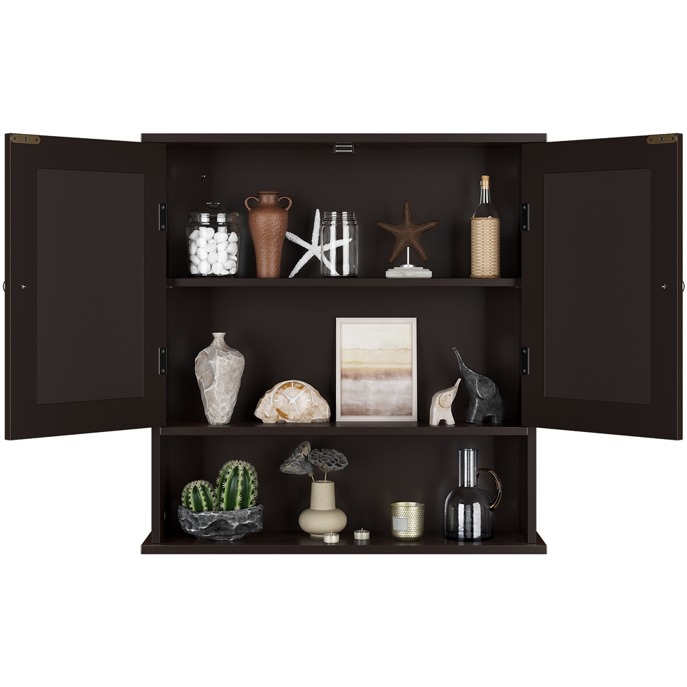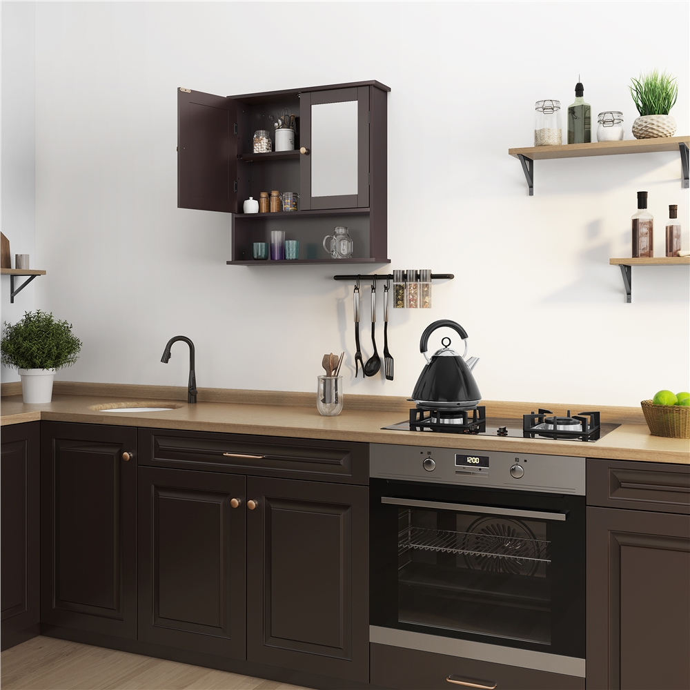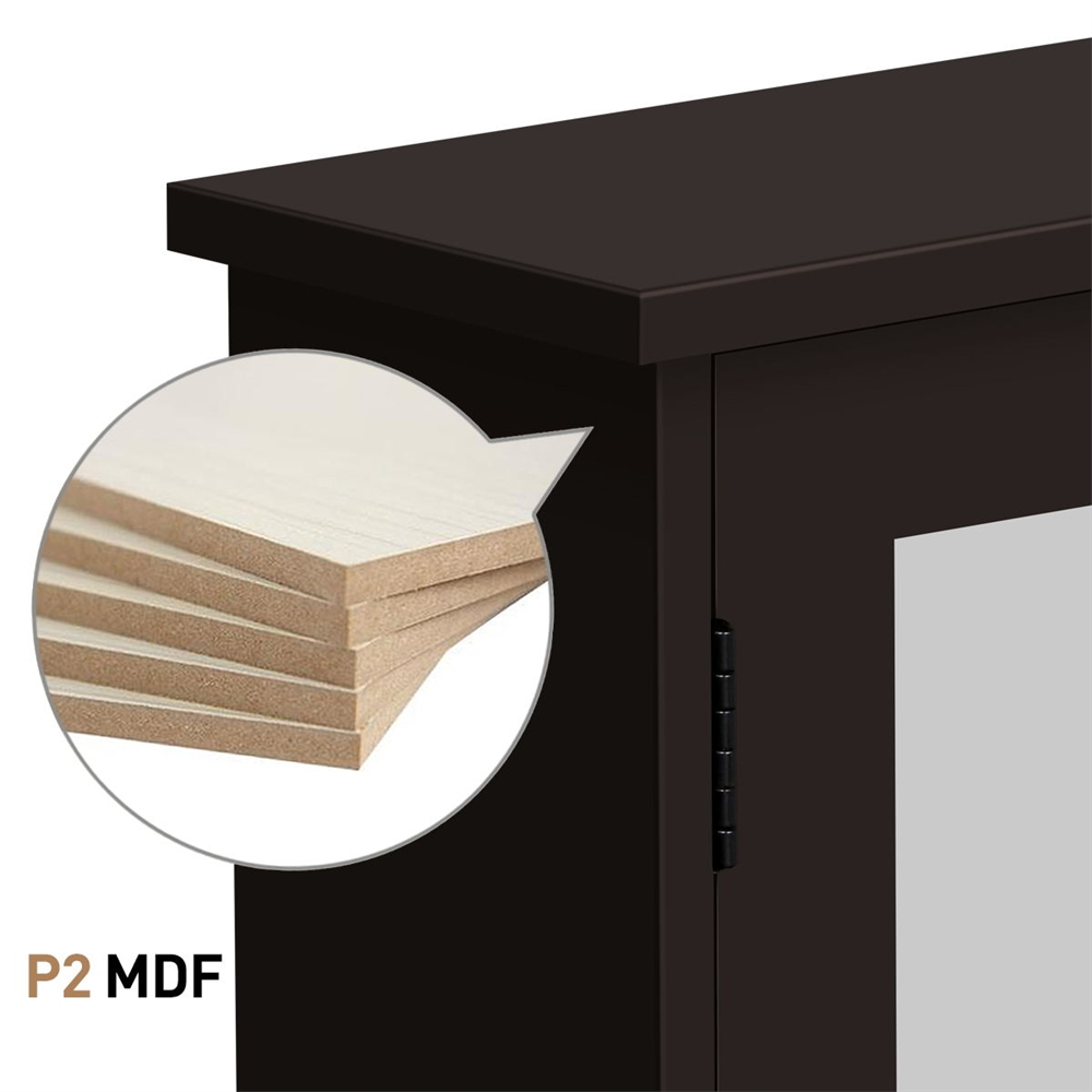 This wall mounted storage cabinet is the perfect piece for your kitchen or bathroom. The mirrored doors are perfect for helping with your everyday makeup application or shaving. No need to purchase an additional mirror! The shelving inside provides ample storage to help organize any clutter. We have finished our product with a primer that makes this product water-resistant. Do not worry about any spills! Simply wipe down with a damp cloth. The sleek and transitional style makes this wall-mounted cabinet blend in with any and all home decor. Simple assembly is required and detailed instructions are included. Easyfashion Wall-Mounted Mirrored Storage Bathroom Cabinet: *- Material: painted P2 MDF & glass & iron hardware *- Overall dimensions: 56 x 13 x 58 cm / 22 x 5 x 23"(LxWxH) *- Adjustable shelf height: 12.8 cm / 5"; 19.5 cm / 7.7"; 26.8 cm / 10.6" *- Open shelf size: 51 x 10 x 15 cm/ 20 x 4 x 5.9 (LxWxH) *- Mirror size: 30.5 x 17.2 cm / 12 x 6.8"(LxW) *- Door panel size: 39 x 25.3 cm / 15.4 x 10"(LxW) *- Maximum weight capacity: cabinet top: 6 kg / 13 lb; tier: 4 kg / 8.8 lb; open shelf: 6 kg / 13 lb *- G.W.: 6.9 kg / 15.2 lb *- Color: espresso *- Please Note: Please do not overload. *- Easy to assemble: all necessary hardware and instructions included