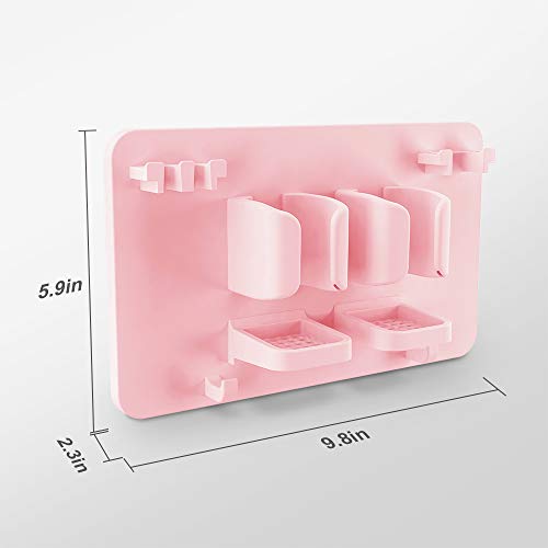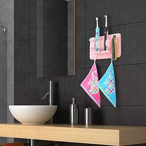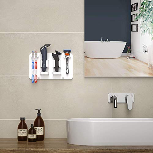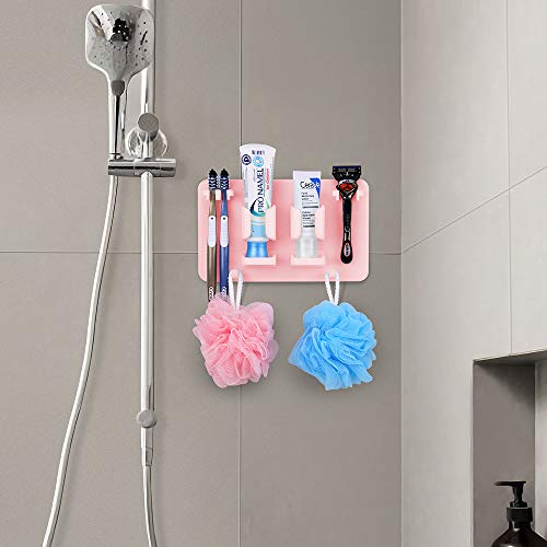 - Mighty Hanging Shelf - There are 2 hangers above the toothbrush holder, 2 large slots in the middle, and 2 hooks below. The upper two hangers can hang your electric toothbrush head, manual toothbrush or razor. The two large slots in the middle can fit your electric toothbrush, toothpaste, facial cleanser or electric shaver. The two lower hooks can hang your washcloth, towel, loofah, shower cap, cup with handle, etc.