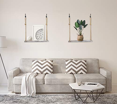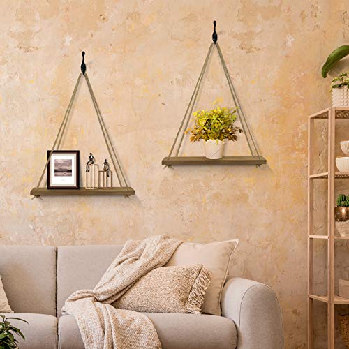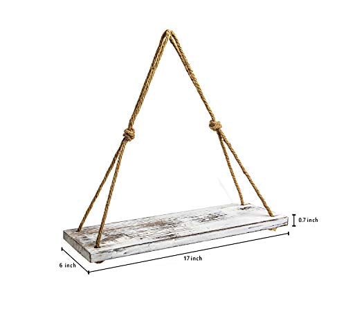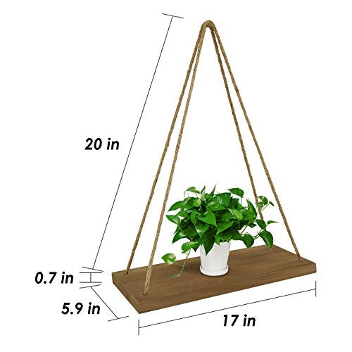 - [Stable Wall Hanging Shelves]:These hanging shelves are appealing and sturdy. Each is made of strong wooden boards (17" x 5.9" x 0.7") featuring a rustic-style torched finish.Each wall shelf is suspended by two 0.3 inch thick jute ropes ,hanging rope - adjustable up to 21 H in inches),sturdy and stable for wall shelving