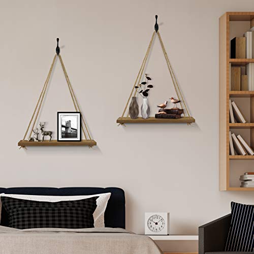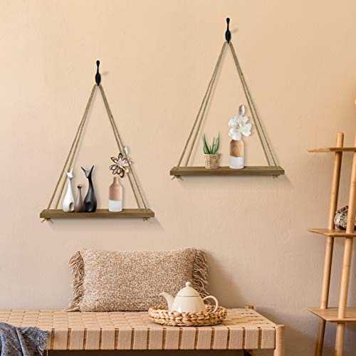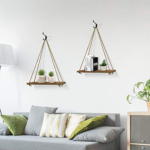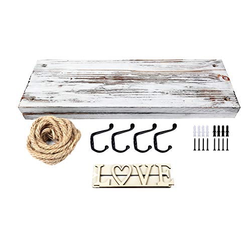 - [Unique]: Our wood hanging floating shelves are made of solid wood boards (17" x 5.9" x 0.7") featuring a rustic-style torched finish.It comes with 2 pcs 8.2 ft long jute rope and 4 pcs black hooks to match your decor.Screws are included so you can use these hanging shelves right away!