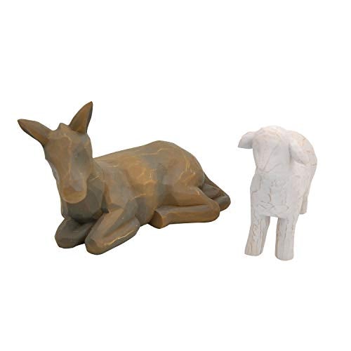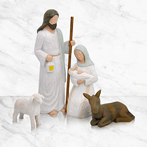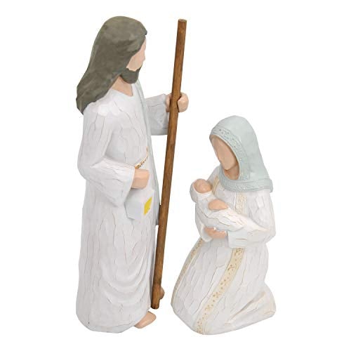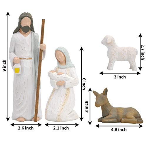 - SUPER VALUE PACK. Our Christmas Story decorative Set includes 4 pieces of Sculpted Hand-Painted Style Resin Figures. Contains Joseph, Mary, Baby Jesus, Donkey and sheep. Joseph figurine is 2.6 inch x 9 inch, Mary holds baby Jesus figurine is 2.1 inch x 6 inch, lying donkey figurine is 4.6 inch x 3 inch and stand lamb figurine is 3 inch x 2.7 inch. Packaged in one fitted box ready for gift-giving, easy to incorporate with holiday decor.